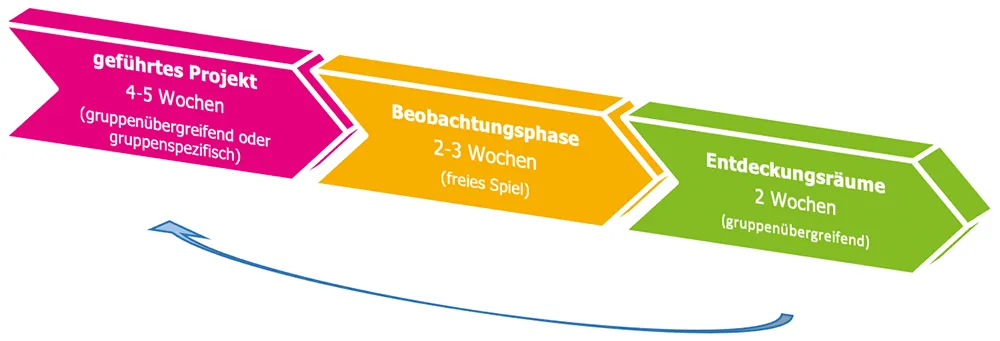 An fix festgelegten Wochen im Jahr sind die Gruppen für zwei Wochen offen. Die Kinder erhalten anhand eines Rituals die Möglichkeit, sich für einen Entdeckungsraum zu entscheiden. Dort werden die Kinder durch die für das Angebot in diesem Entdeckungsraum verantwortliche Fachperson beim Experimentieren und Erforschen begleitet. Die Fachpersonen ermöglichen den Kindern freies Beschäftigen oder bieten bedürfnisorientierte und altersgerechte Aktivitäten an. Den Säuglingen wird ein separater Entdeckungsraum angeboten.Die Entdeckungsräume werden anhand der getätigten Beobachtungen bzw. momentanen Bedürfnissen und Interessen der Kinder gestaltet. Mögliche Inhalte der Entdeckungsräume (keine abschliessende Aufzählung) sind: Sprache, Bauen und Konstruieren, Kreativität, Farben, Technik, Zahlen und Formen, Naturwissenschaft, Sozial-kulturelle Bezüge (Rollenspiele, Theater, Schminken, Verkleiden), Ernährung, Bewegung/Entspannung und Musik.